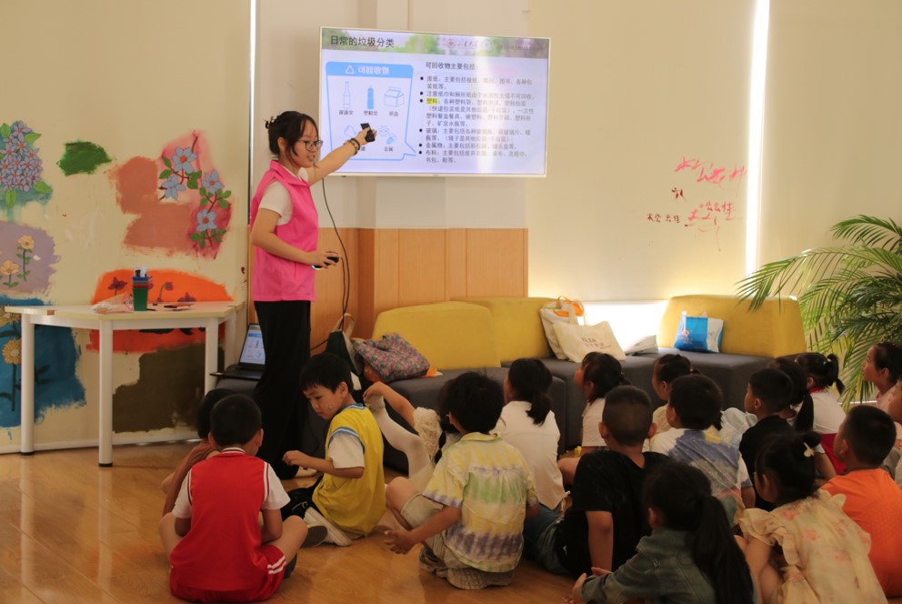 一天的課程在小朋友們朗朗的讀書聲中徐徐展開。如果信仰有顏色,那一定是中國紅。在低年級和中年級的“思想引領”課上,隊員寧彩羽帶領小朋友們共同認識了黨旗、國旗、軍旗、團旗和隊旗,并引導他們正確理解和看待祖國的旗幟。鮮艷的中國紅倒映在孩子們的眼中,飽含著他們對旗幟的敬畏之心。隊員叢榕從零出發,將低年級孩子們一步步領入英語的世界。課堂生動而又風趣,多彩的卡通圖片以及機器貓的形象,調動了孩子們的學習熱情,認讀了apple、ant、alligator等新鮮詞匯。垃圾分類已成為當下實現垃圾減量化、資源化,并改善我們的生活環境的重要措施。隊員黃詩藝在“文明生活”課上耐心教會孩子們進行垃圾分類,思考現存的環境問題以及人類與自然的關系,引導孩子們樹立人與自然和諧共生的環保理念。