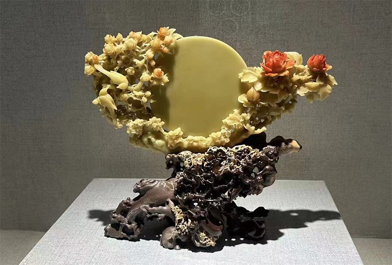 接著,實踐團隊來到實踐的最后一站——青田石雕博物館。首先,團隊成員們進入的是蓋章區,通過打卡集章留下紀念,增進對青田印章文化的了解。接著,團隊成員來到觀影區,觀看了一個關于青田石雕歷史發展的視頻,了解到青田石的形成、種類和雕刻技藝。最后,實踐隊進入石雕展廳,在講解員的講解下了解了不同種類的青田石雕和許多具有極高藝術價值的石雕展品。其中最值得一提的是倪東方的石雕作品《花好月圓》。通過講解員,實踐隊了解到《花好月圓》色彩典雅,溫潤似玉。倪東方大師運用中國畫中繁簡對比虛實相間的構圖理念,將薄薄的一片青田封門凍石小心翼翼的雕琢成一輪滿月,牡丹紫藤及喜鵲構成一幅玉宇明凈,月出花叢鵲棲枝頭的美景。這件現實與浪漫手法相結合的藝術珍品于1992年被國家郵電部選為特種郵票印制發行,此后仿制者如潮。在青田石雕博物館中還有許多諸如此類優秀的石雕作品,它們無一不展示著青田石雕匠人們巧奪天工功的卓越技術,無一不展現著青田流傳百年而不朽的工匠精神。