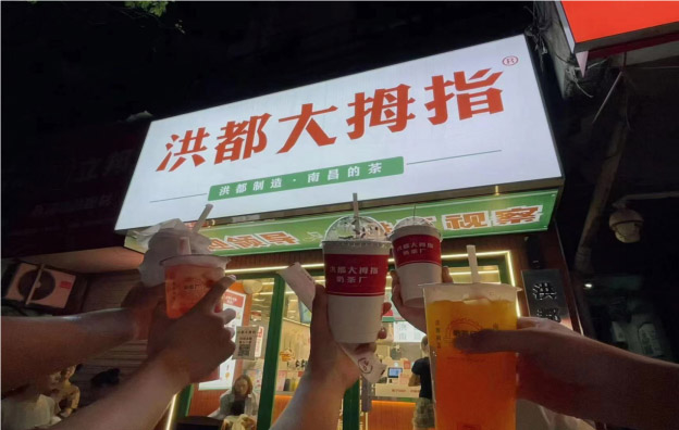 隨著時代的飛速發展,奶茶作為一種新興飲品迅速在各個城市里扎根,各地都有屬于自己的奶茶品牌,此次團隊成員也品嘗了南昌的獨特奶茶品牌洪都大拇指。洪都大拇指的雪頂系列,通過奶油與牛奶的結合增加了口味的層次感,同時洪都大拇指也提供烤腸和小吃,深受顧客的喜愛。