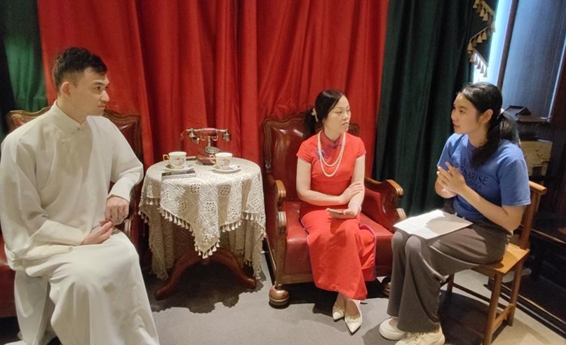 作為調查的補充,調研小隊還分別于蘇州平江路的月出·半遮面評彈館和蘇州市工業園區荷韻社區的荷韻書場進行表演欣賞。盡管部分方言唱詞對小隊成員來說存在一定理解障礙,但老師們婉轉悠揚的唱腔和生動傳神的演繹仍讓調研小隊深刻感受到了評彈藝術的古典韻味與強大生命力。隊員們還采訪了幾位資深評彈演員——徐文龍老師、朱怡老師,并與在荷韻書場演出的蘇州市評彈學校的楊柳老師及學生們進行了面對面的交流。