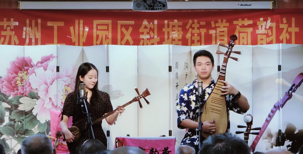 午后,調研小隊前往位于蘇州市工業園區荷韻社區的荷韻書場,與在此演出的蘇州市評彈學校楊柳老師及學生們進行了面對面的交流。楊柳老師以其深厚的藝術造詣和滿腔熱情,分享了她在評彈傳承與創新方面的探索與實踐。楊老師強調了聽眾與演員之間的相互關系,表示“好的演員需要好的聽眾”,這引發了小隊成員們對傳統文化傳承方式的深思。