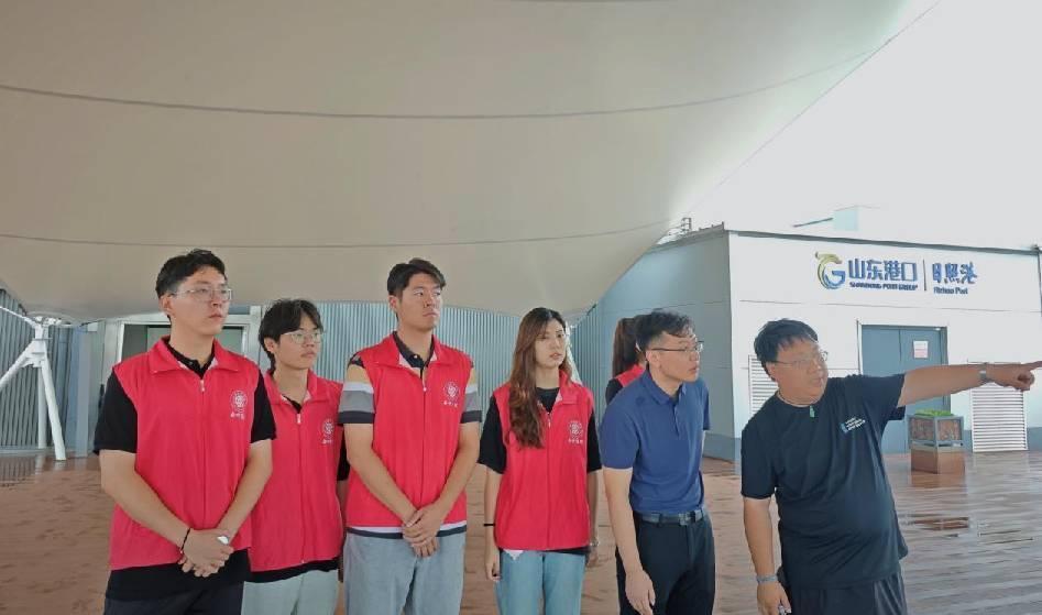 抵達日照港后,雖恰逢陰雨天氣,但團隊成員熱情不減,他們以石臼港媒碼頭為起點開展實踐活動,凝神傾聽日照港的輝煌歷程。港口從改革開放初的荒灘起步,老一輩建設者炸礁填海,鑄就現代煤碼頭基石。“黃海灘頭千年睡,日照東岸巨港出”是時任國務院副總理李鵬對日照港的肯定。現今,日照港已成為億噸大港,并在新時代轉型為智慧綠色港口,獲國務院認可為大宗干散貨示范港。碼頭上的繁忙與變遷,是日照港四十余載不懈奮斗的生動寫照,讓團隊成員深切感受到港口與城市共興共榮的深厚底蘊。