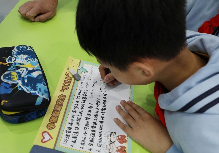 “管道大挑戰”游戲環節成為活動的亮點。學生們在志愿者的指導下分組合作,親手實踐連接水管,確保最佳密封性,并在探索中識別生活中的管道安全隱患。這不僅提高了他們的團隊協作能力,也增強了自我保護意識。
