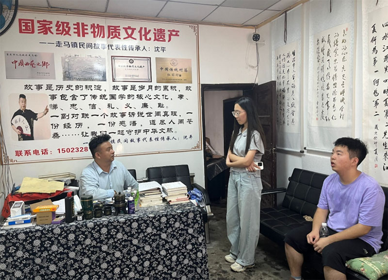 實踐團探訪的第一站是一家走馬故事館,這里收藏和傳承著走馬古鎮豐富的民間故事。在館內,我們有幸采訪到了負責人,他向我們詳細介紹了走馬民間故事的流傳歷程。“這些故事是祖輩們口口相傳下來的,蘊含著許多為人處事的大道理。”他說道。據他介紹,現存可查的民間故事有上萬則,如《三兄弟找寶》、《慈云寺的傳說》等,每一則都富有深意,引人入勝。“走馬民間故事說的是忠孝禮義廉恥,講的是人間滄桑、悲歡離合。”實踐團成員了解到走馬民間故事內容龐雜、類型多樣,除了民間傳說故事的一般類型,如神話仙話、民俗傳說和生活故事等外,還蘊藏著其他獨特的文化信息,對多種學科具有很高的研究價值和歷史文化價值。在走馬古鎮,類似的故事館還有很多,它們共同守護著這片土地的文化記憶。