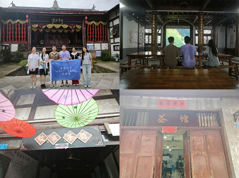 沿著古鎮的石板路前行,實踐團成員來到了另一處充滿生活氣息的地方——茶館。這里的茶館文化與戲樓文化、口傳民間故事文化緊密相連。古時,人們在這里歇腳品茶,聽戲說書,催生了獨特的茶館、戲樓和戲臺文化。這里成為了人們社交和文化交流的重要場所,也催生出了許多民間故事和表演藝術。實踐團走訪了當地的叔叔阿姨,他們熱情地向成員們講述了茶館里的故事和戲樓上的傳奇。