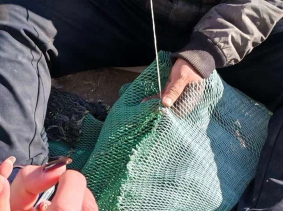 圖為村中的一位大爺正在修補(bǔ)自己的漁網(wǎng)