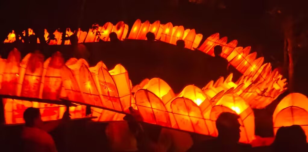 游龍燈的時候,由人抬著龍珠走在最前面緊隨其后的是龍頭,然后是家家戶戶的橋燈,最后是龍尾。旁邊是鑼鼓隊和禮炮隊。鑼鼓隊鼓敲兩下,鑼敲一下,發出“咚咚鏘、咚咚鏘”的聲音,邊走邊打。而各家各戶需要等候在自家門口,待聽見鑼鼓聲,立刻點燭燒香,“龍”一到立刻燃放煙花爆竹,這就是“接龍”,是村民們對來年風調雨順、萬事順遂、煙收糧豐的祈禱,祈求龍賜吉祥、所愿成真。還有一些村民會給“龍”包紅包,請“龍”到家周圍繞兩圈,希望自家來年好運連連,由好事發生!