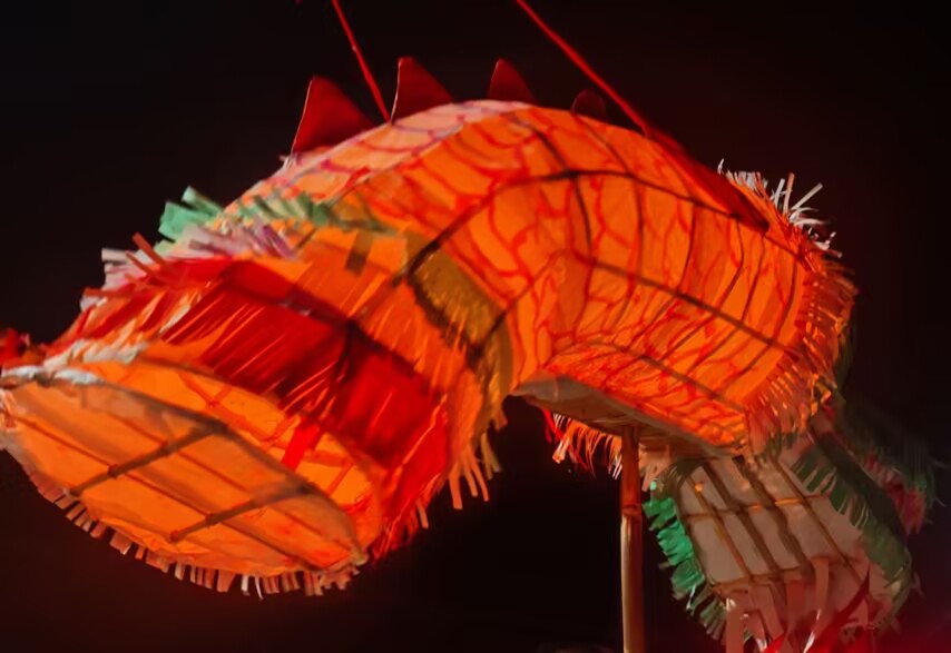 經實踐隊員調研了解,游龍燈的龍分為三部分,分別是龍頭、龍身以及龍尾。龍頭和龍身由竹子編織成型,再用彩紙糊好,龍嘴中或掛有一個八角小燈籠,燈籠八面寫著“四季平安”、“萬事如意”等村民們對新的一年的美好期盼;或銜有一顆龍珠,代表著威嚴。龍身又叫“橋燈”,每一戶有一橋燈,連接起來組成龍身。而一橋燈是由三個由竹子編織成拱形,固定在木板上,木板兩端各鑿一個圓洞,以便連接和栓上抬燈的木棒。長龍由幾百橋連接,短的也有幾十橋。