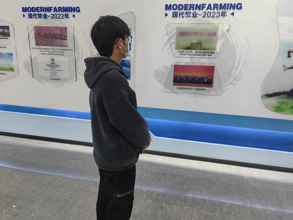 接著,王羽同學來到了五河縣現代牧業基地,見識到了現代化農業與畜牧業的發展前景。在基地內,他了解到了現代化養殖技術和環保措施如何結合,通過科學管理提高了生產效率,同時帶動了當地農民的就業和收入增長。這一切都為五河縣的鄉村振興提供了有力支持。