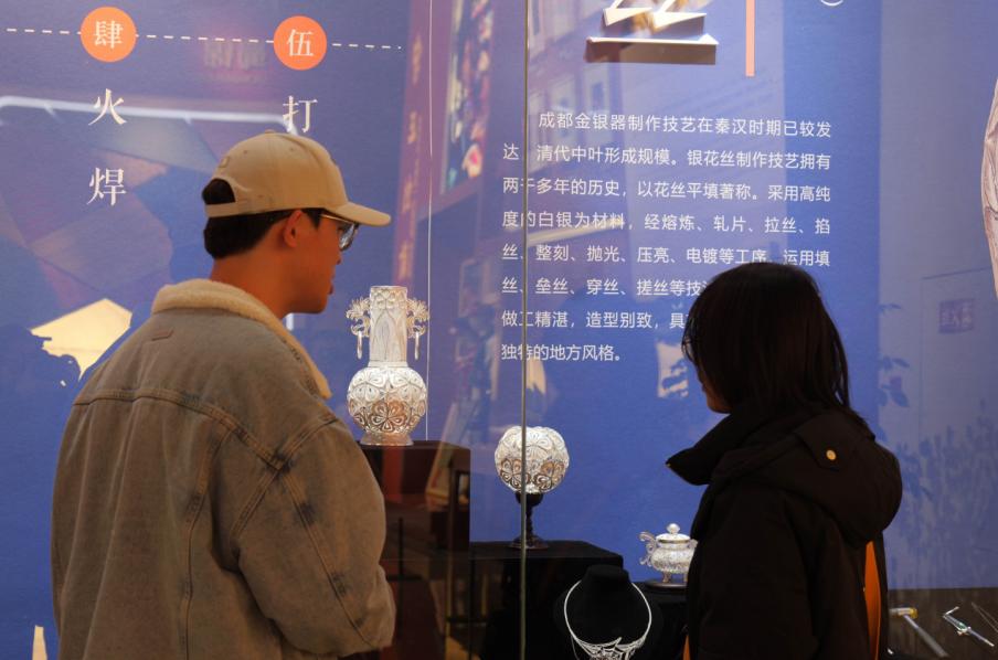 圖為實(shí)踐隊(duì)在成都非遺博覽園講解宣傳成都銀花絲 通訊員 何旻謙供圖