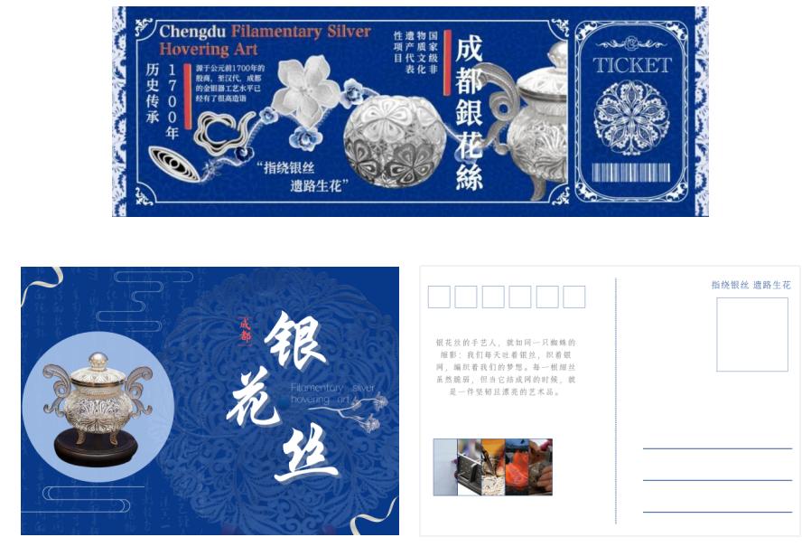 圖為實(shí)踐隊(duì)設(shè)計(jì)的成都銀花絲宣傳文創(chuàng),含鐳射票及明信片(正反面) 通訊員 秦笑迪、胡雯雯供圖