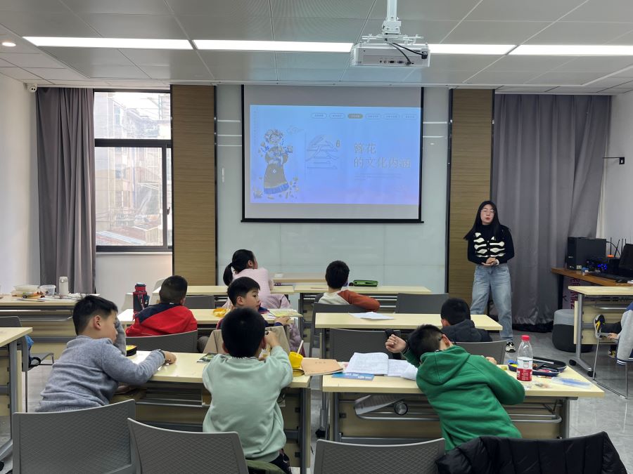活動推進至第二階段,借助PPT的生動展示,孩子們仿佛穿越時空,踏入古韻悠悠的“文化傳承館”。當屏幕中出現頭戴傳統“四季花簪”的省級簪花技藝傳承人李女士時,孩子們瞬間被她發間微微顫動的絨花深深吸引。盧悅手持擁有百年歷史的檀木花模,為孩子們詳細闡釋:“這朵牡丹是由蠶絲一絲一絲捻制而成,從原料的嚴格篩選、精細染色到最終成型,總共需要歷經三十道工序。”孩子們由此深切領略到非遺技藝的精湛與深厚底蘊。