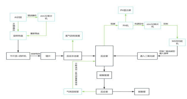 基于碳化分解工藝,該團隊設計了一款集識別、拆卸、反應及智能控制于一體的智能節能裝置。該裝置能夠自動識別電池的正反面,并輔助拆解過程,以達到最大拆解效率。同時,內置的pH智動調控系統能夠自動檢測并調節反應裝置的pH值,從而加快反應速度,提高回收效率。
