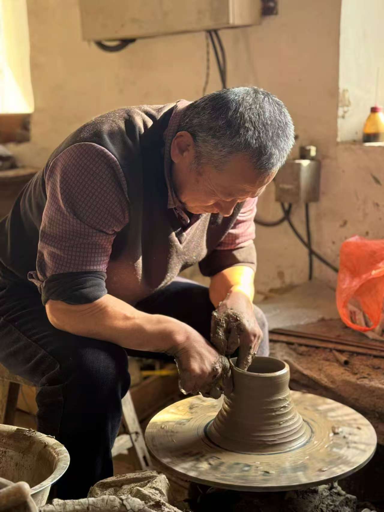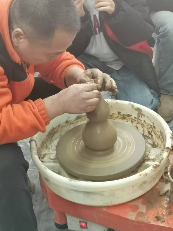 在青島膠州,實踐服務團拜訪了黑陶傳承人葉孝忠。葉孝忠不僅耐心解答團隊成員的疑問,講述黑陶的歷史淵源、獨特魅力和傳承困境,還親自上陣示范拉坯工藝。成員們紛紛上手體驗,在旋轉的泥坯間感受傳統技藝的溫度與力量,將理論知識與實踐緊密結合。