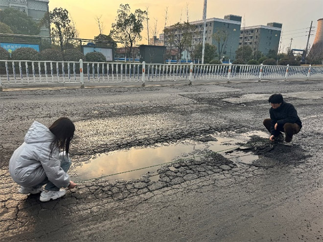 “晴天一身土,雨天兩腳泥”在超山村東側的農耕道上,團隊成員用標尺丈量著蛛網般的裂縫:“這段瀝青路裂縫最寬處有5厘米,雨天積水能淹沒半個電動車輪。”通過調研,團隊發現超山村公路有龜裂蔓延、接縫空隙大、積水頑疾等問題。