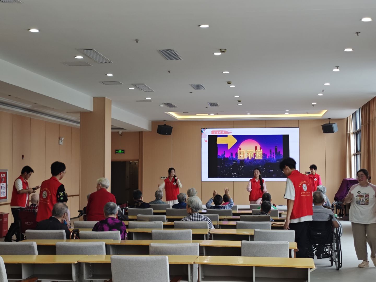 下午2點半到3點半,公寓一樓活動區開展大學生匯演活動。志愿者們在積極參與籌備活動的同時,社工部的志愿者們策劃后期活動與打印文件資料;辦公室的志愿者們整理相關資料,排查養老院檔案文檔;失智專區的志愿者制作了彩紙小卡,用通俗易懂的方式傳播著專業知識,讓老人簡單了解英語的魅力。這些準備使得下午的活動開展的井然有序,養老院的老人對活動也給予了高度的評價,活動現場妙趣橫生。