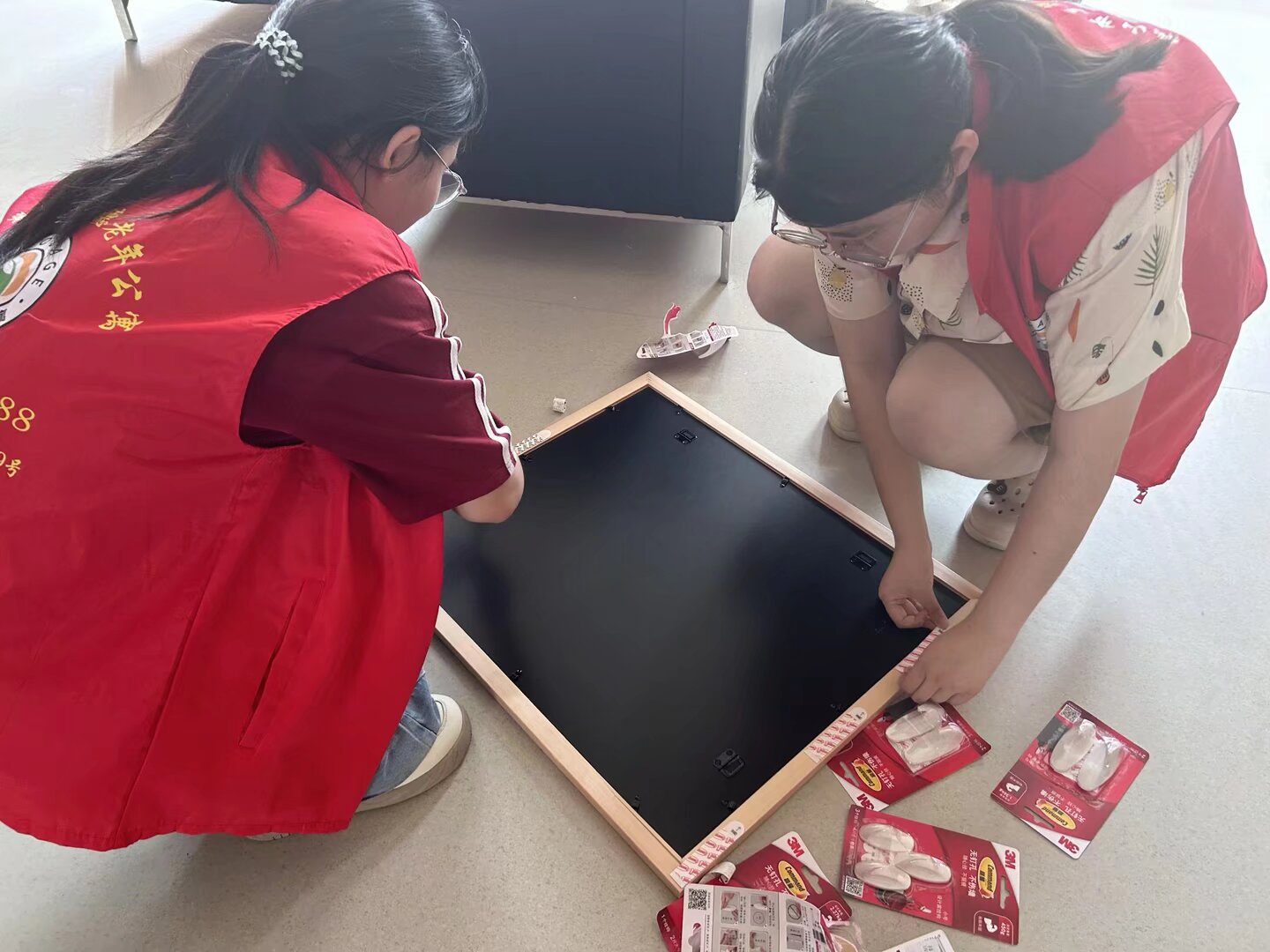 圖為志愿者們在粘貼畫框。 郭弋歌 供圖