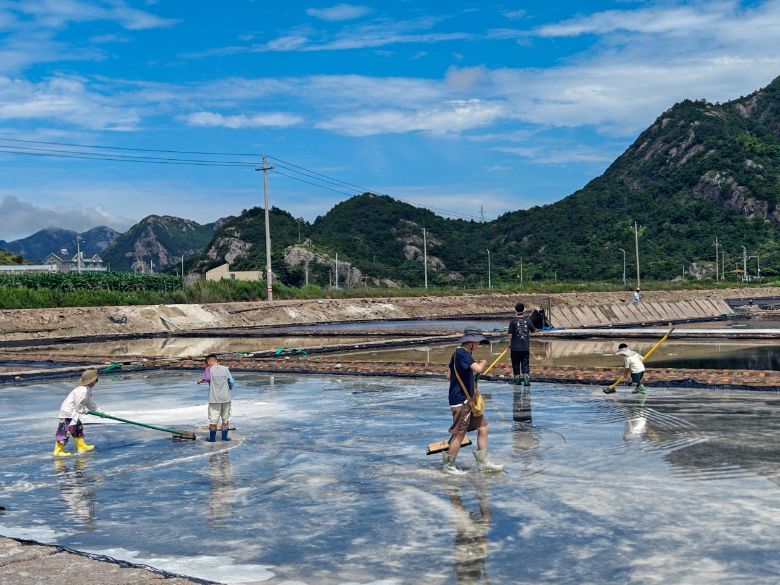 次日,團隊乘船前往花岙島,考察被譽為“浙江最后手工鹽場”的花岙鹽場。該鹽場占地約1200畝,制鹽歷史可追溯至漢代,其古法曬鹽技藝于2008年被列入國家級非物質文化遺產。隊員們參觀了鹽田和“花岙鹽場海鹽博物館”,了解曬鹽歷史與工藝流程。