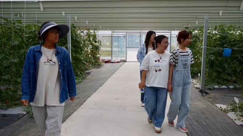 圖為"果香潤農心,鄉(xiāng)村助振興"社會實踐團隊成員在工作人員的帶領下參觀西瓜種植園。薛粲雨攝