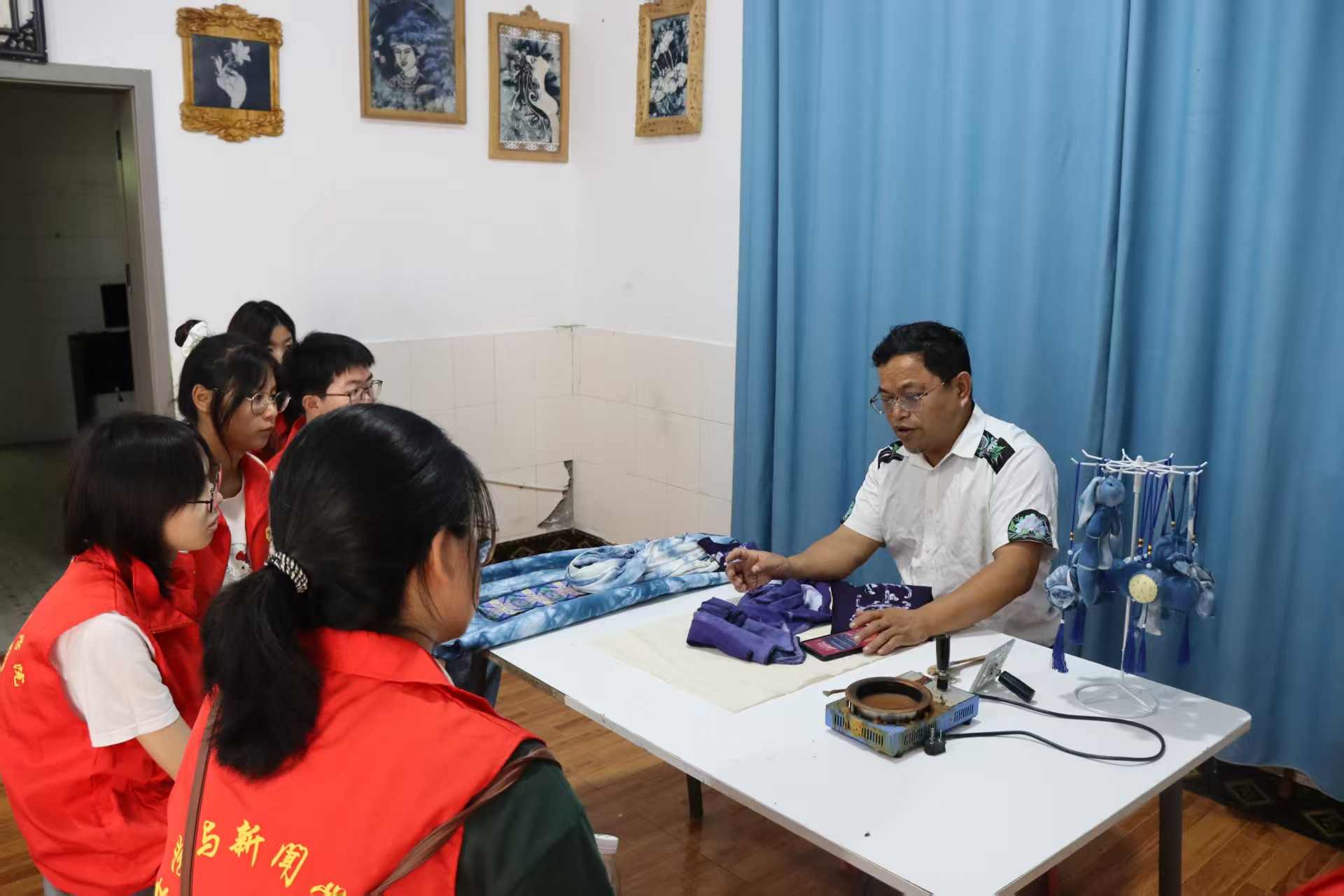 2025年7月2日,湘約筑夢實踐團成員奔赴湘西板栗村,開展探尋非遺印記與蠟染體驗活動。向蠟染技藝傳承人石杰忠學習扎染和蠟染,并走進扎染工藝基地,沉浸式感受扎染的獨特魅力。上午,成員們來到了板栗村殘疾人之家,蠟染非遺傳承人石杰忠向成員們講述和展示了蠟染技藝的歷史淵源、形式分類、操作方法,成員對蠟染扎染這個非物質文化遺產有了初步的了解和體會,從而更進一步地感受它獨特的魅力。