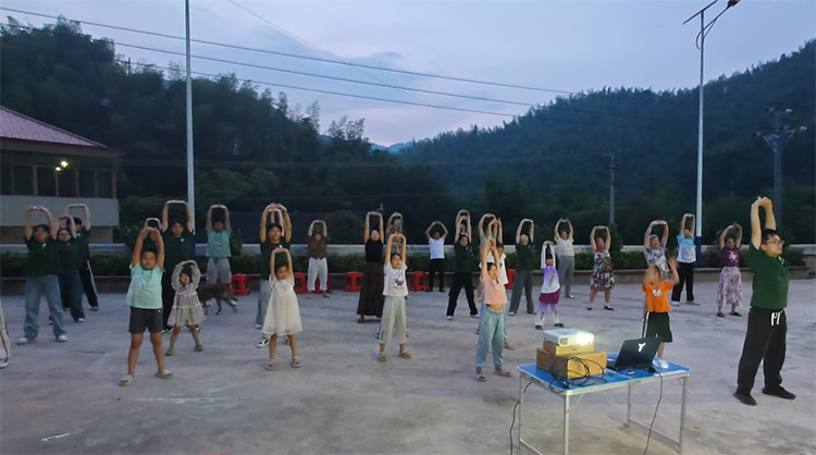 實踐團的小伙伴們,也化身“健康小衛士”,穿梭在人群間。他們或是為老人調整手勢,或是陪著孩子練習步伐,一個個專注又認真。村民們從最初的生疏,到漸漸跟上節奏,眼神里的好奇與羞澀,慢慢化作投入與享受;孩子們則像歡快的小鳥,跟著老師的動作蹦跳伸展,稚嫩的臉龐上,滿是對傳統健身功法的新奇與熱愛。