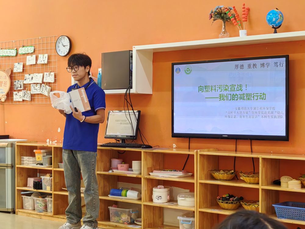 七月流金時,草木正蔥蘢。7月3日下午3點,安徽師范大學生態與環境學院“幼兒環保啟蒙,青年生態宣講”實踐團隊走進沿河小區幼兒園,以“減塑護地球”為主題,為孩子們帶來一堂生動有趣的環保課,讓“綠色理念”在互動中扎根童心。