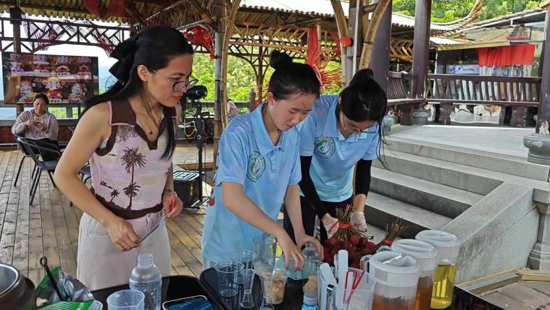 圖為實踐隊員在調(diào)制荔枝特色茶飲