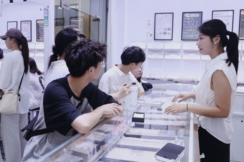 賦能·珍珠與襪業(yè)里的“楓橋動(dòng)能”6月20日至21日,實(shí)踐團(tuán)轉(zhuǎn)向產(chǎn)業(yè)一線。在山下湖華東國際珠寶城中,我們見證了珍珠從砂礫到珍寶的蛻變過程,恰似“楓橋經(jīng)驗(yàn)”六十余載的成長(zhǎng)軌跡,歷久彌新。我們走訪了十余家商戶,在問起當(dāng)?shù)卣渲楫a(chǎn)業(yè)發(fā)展現(xiàn)狀時(shí),店長(zhǎng)余女士告訴我們,當(dāng)下珍珠養(yǎng)殖早已從傳統(tǒng)手工養(yǎng)殖模式邁向科學(xué)化、規(guī)模化培育,并且相較于海水珍珠,近年崛起的愛迪生淡水珍珠價(jià)格更親民,品質(zhì)高的愛迪生珍珠甚至能媲美海水珍珠,成為很多國產(chǎn)品牌的重要競(jìng)爭(zhēng)力。