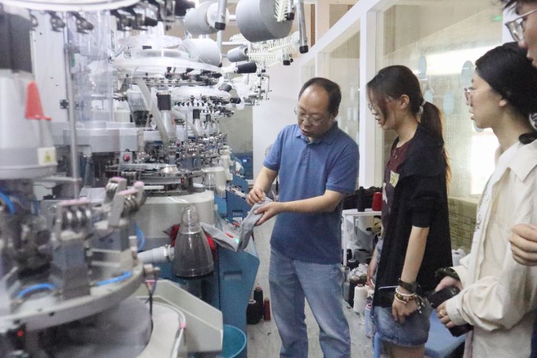 斯淼鐘老師向?qū)嵺`團(tuán)展示現(xiàn)代織襪機(jī)