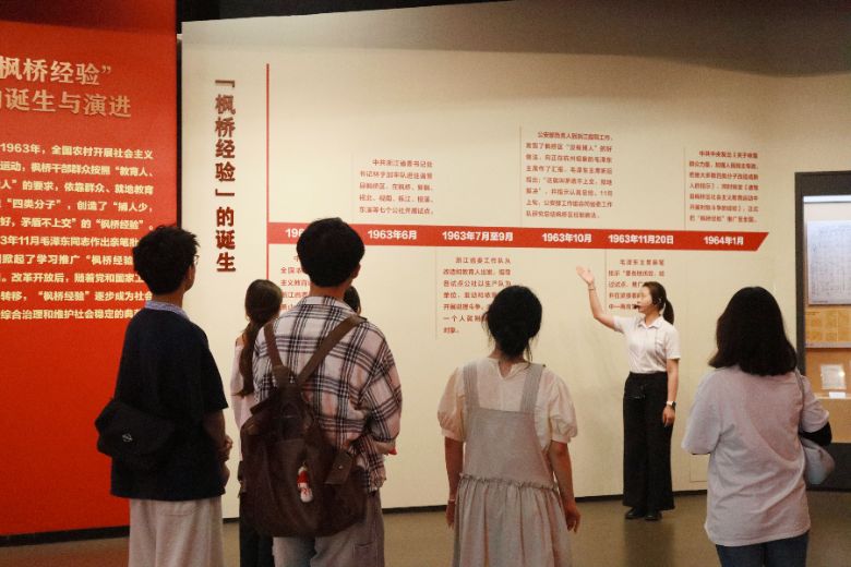 尋根·陳列館里解碼“楓橋秘密”6月19日,實(shí)踐團(tuán)首站抵達(dá)楓橋經(jīng)驗(yàn)陳列館。講解員為我們進(jìn)行詳細(xì)的史料分析與案例解讀,帶領(lǐng)我們探索這一誕生于1963年的基層治理模式歷久彌新的奧秘。“‘發(fā)動(dòng)和依靠群眾,堅(jiān)持矛盾不上交’不僅是口號(hào),更是刻進(jìn)楓橋人骨子里的基因。”講解員強(qiáng)調(diào)道。