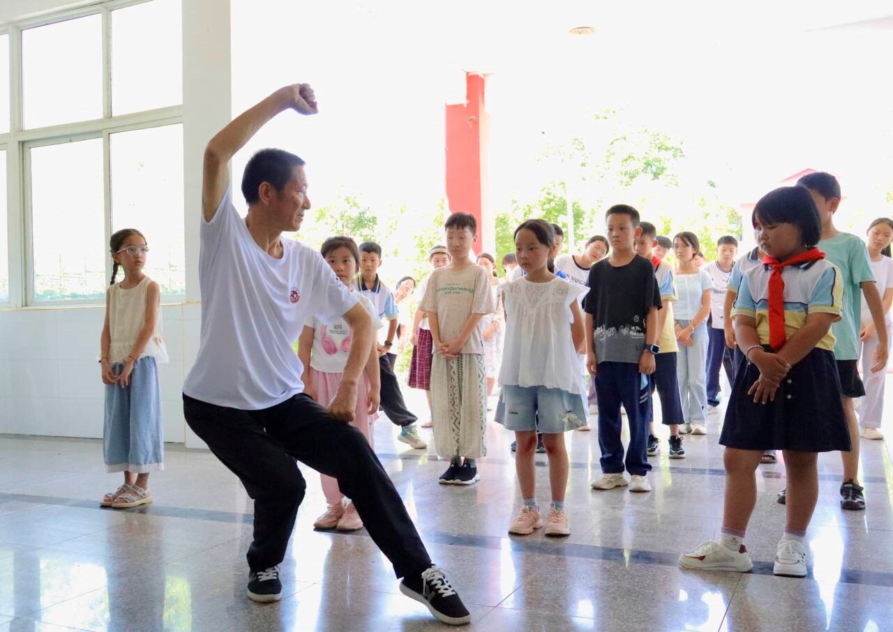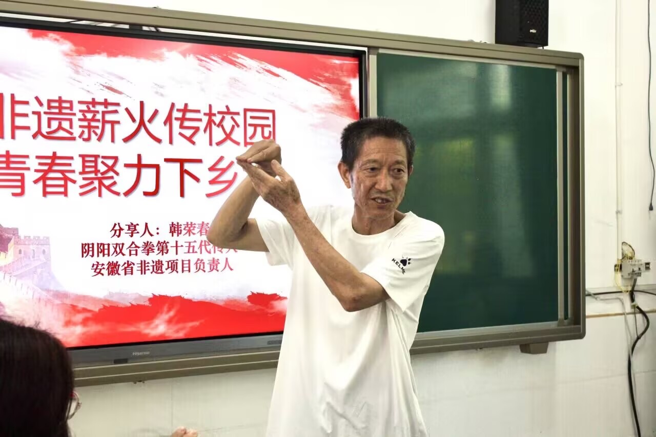 7月4日,合肥大學(xué)語言文化與傳媒學(xué)院暑期三下鄉(xiāng)社會(huì)實(shí)踐團(tuán)隊(duì)邀請(qǐng)陰陽雙合拳第六代傳人、安徽省非遺項(xiàng)目負(fù)責(zé)人韓榮春老先生,于石板沖鄉(xiāng)初級(jí)中學(xué)開展非遺技藝教學(xué)活動(dòng)與“非遺進(jìn)校園”分享會(huì),推動(dòng)中華優(yōu)秀傳統(tǒng)文化創(chuàng)造性轉(zhuǎn)化與創(chuàng)新性發(fā)展。