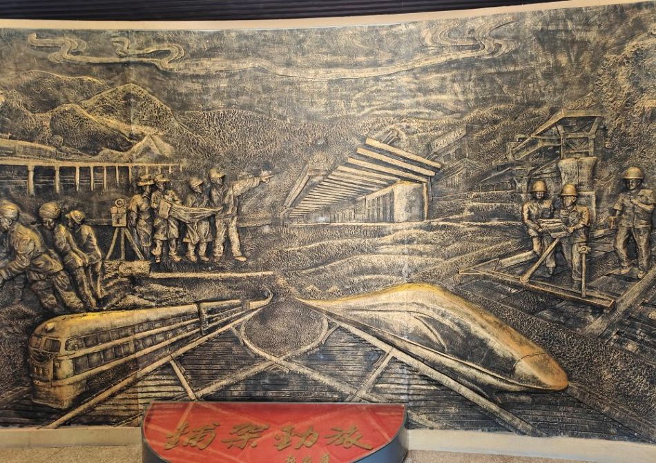 一、雕塑徽章,精神初彰 踏入展覽館,“鋪架勁旅”主題浮雕墻撲面而來。山脈為幕,鐵道兵勘測、施工的身影凝固成永恒;軌道作線,老式列車與高鐵動車“相遇”,串聯起從戰火硝煙到高鐵騰飛的歲月。這不僅是歷史場景復刻,更是鐵道兵“逢山鑿路、遇水架橋”精神的具象化——從戰火硝煙到和平建設,從蒸汽機車到高速動車,變的是時代與裝備,不變的是開路先鋒的擔當。