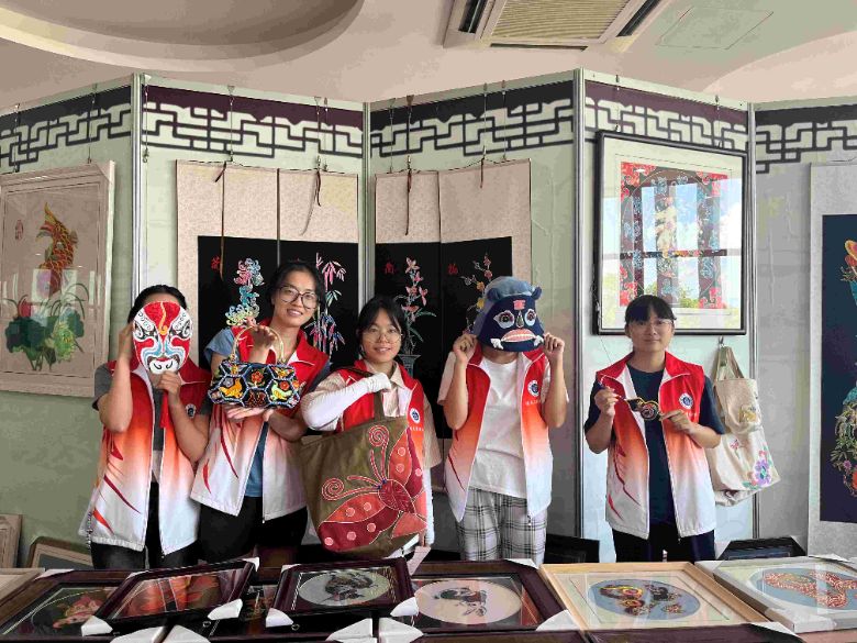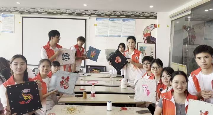 實(shí)踐隊(duì)自公交站啟程,輾轉(zhuǎn)抵達(dá)首站陽(yáng)新文化館。踏入館內(nèi),館長(zhǎng)化身“文化引路人”,帶領(lǐng)滿天星實(shí)踐隊(duì)穿梭時(shí)光。“陽(yáng)新老八景”水墨間勾勒出往昔陽(yáng)新風(fēng)光;漁網(wǎng)漁具雖已斑駁,但漁歌與風(fēng)聲似在耳畔回響;陽(yáng)新傳統(tǒng)農(nóng)具靜靜陳列,觸摸間,先輩耕耘的溫度透過(guò)滄桑木石傳遞。戲劇排練廳內(nèi),陽(yáng)新傳統(tǒng)采茶戲的演員們一唱一和、一招一式間,把鄉(xiāng)土故事、民俗風(fēng)情融入旋律,演繹著傳統(tǒng)藝術(shù)的鮮活生命力。隊(duì)員們?cè)诜沁z布貼中心,在非遺傳承人的指導(dǎo)下,將金線銀線化作畫筆,裁剪、拼貼、縫制。當(dāng)?shù)谝黄假N在自己手中成型時(shí),隊(duì)員小王輕聲感嘆:“原來(lái)非遺不是博物館里的標(biāo)本,而是能握在手里的溫度!”指尖摩挲間,隊(duì)員們感知到非遺的細(xì)膩溫度,解鎖陽(yáng)新非遺布貼的“創(chuàng)作密碼”,也讓古老技藝在青春創(chuàng)作中煥發(fā)新活力,實(shí)現(xiàn)傳統(tǒng)與現(xiàn)代的奇妙對(duì)話。