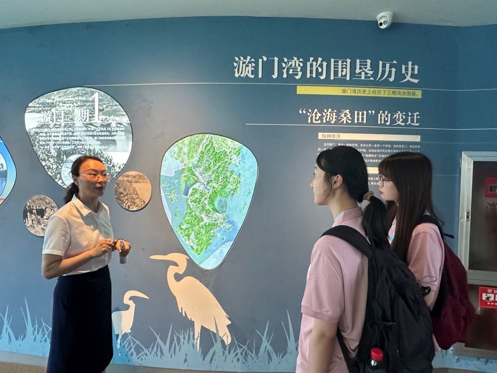 呂科長首先帶領實踐團來到漩門灣濕地公園科普館,在這里為實踐團介紹了漩門灣的故事,這是一部人與自然相互塑造的壯麗史詩。漩門灣的形成源于古代地殼運動,這造就了獨特的漩門海峽。然而,真正改變其面貌的是上世紀七十年代起的三期大規(guī)模圍墾工程,這些工程在解決土地資源短缺的同時,也深刻改變了海灣的自然生態(tài)格局。正是在一期、二期圍墾工程形成的基礎上,生態(tài)保護的意識開始覺醒。訪談中,呂科長向我們展示了這片土地從“人定勝天”的圍墾時代,到生態(tài)意識覺醒、科學修復保護,最終成為“鳥類天堂”和“觀鳥勝地”的艱辛歷程。實踐團成員們認真聆聽、詳細記錄,并不時追問細節(jié),力求理解生態(tài)修復背后的科學理念與管理智慧。實踐團成員深刻感受到,漩門灣的蛻變史,正是一部生動的“綠水青山就是金山銀山”理念實踐教科書。