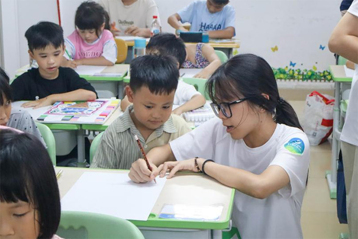 (圖為繪畫課上小朋友認真聽隊員授課畫面)