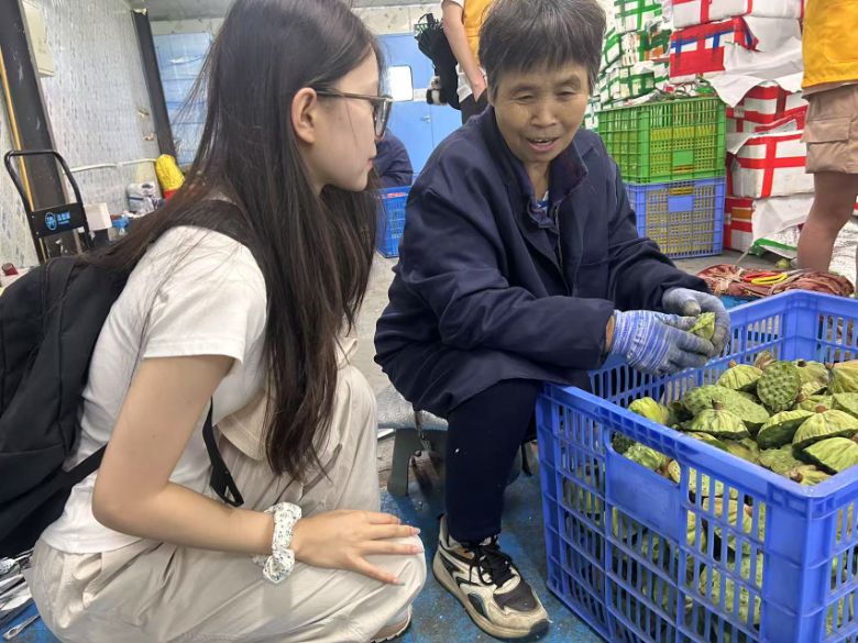 實踐不僅輸入,更重輸出。在桃園村,小隊化身“流動課堂”,身著黃馬甲深入農(nóng)戶與集市。在王阿姨家,隊員舉著“食安守護戰(zhàn)”標牌,講解“裂果易滋生細菌,需及時篩除”;集市上,向商戶科普“槜李保鮮要透氣包裝、低溫儲存”。“以前憑經(jīng)驗,現(xiàn)在懂科學更靠譜!”村民李大叔感慨。在奶奶工坊,問卷調(diào)研與訪談收集銀發(fā)群體實際訴求,確保科普內(nèi)容直擊痛點。把復雜的知識轉(zhuǎn)化為‘鄉(xiāng)土語言’,破除‘水果代餐’等誤區(qū),讓村民掌握知情權(quán)、監(jiān)督權(quán),是清廉社會建設的群眾基礎。