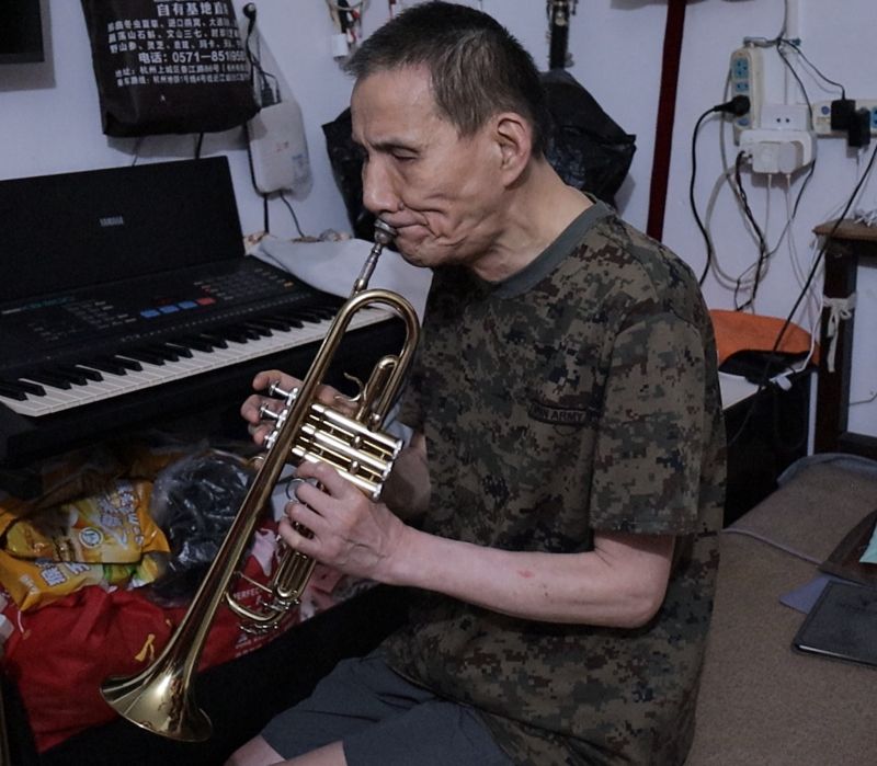 采訪結束后,湯叔叔主動拿出小號和電子琴,詢問大家喜愛的曲目并現場演奏。沒有專業的技巧、沒有旁人的指導,雙目失明的湯叔叔能彈出流暢的曲子,靠的是自己的一步步摸索。