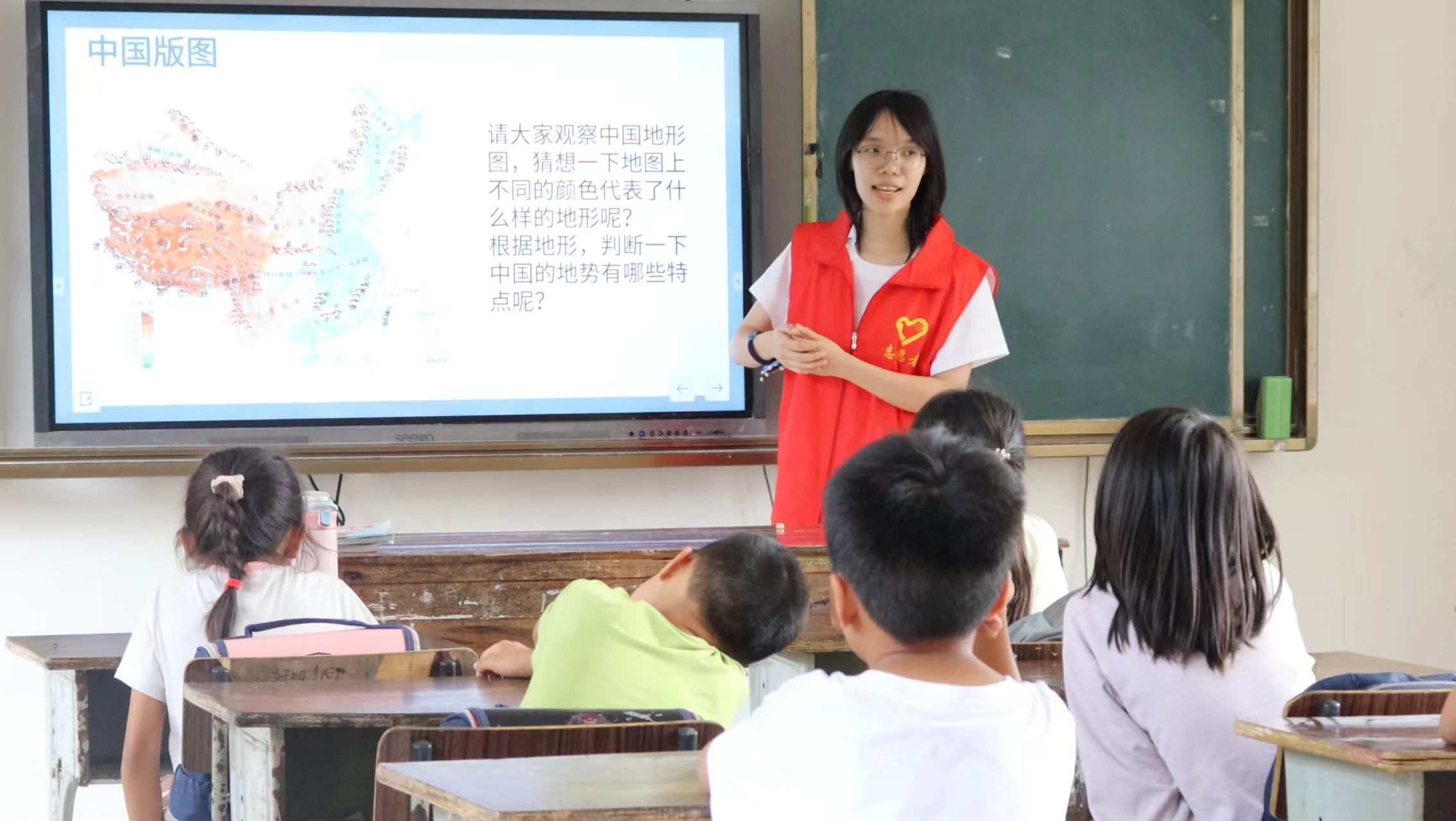 三、賡續紅色血脈,賦能鄉村教育 “同學們,今天讓我們通過地圖來學習黨史”。恰逢“七一”建黨節,“湘約筑夢”實踐團來到黃金村傍海小學,給四年級22名學生開展了一場別開生面的紅色支教活動。成員譚奧林以英文歌曲《Little Star》拉開支教活動序幕,利用漢語國際教育專業知識,通過英語教學活躍課堂氛圍。成員王之婧運用湘西地圖與長征路線圖,講解了湘西州地貌特征和歷史沿革,重點介紹了長征時期中國共產黨在湘西地區的革命路線和紅色故事,描繪了革命先輩們艱苦卓絕的奮斗歷程。通過小組交流,將孩子們眼中“遙遠”的黨史轉化為可觀可感的紅色精神。傍海小學的少先隊員李梓萌說:“通過這堂黨課,我對黨的向往與崇敬之情更加強烈,我將繼續努力學習,以后要爭取成為一名光榮的共產黨員。”