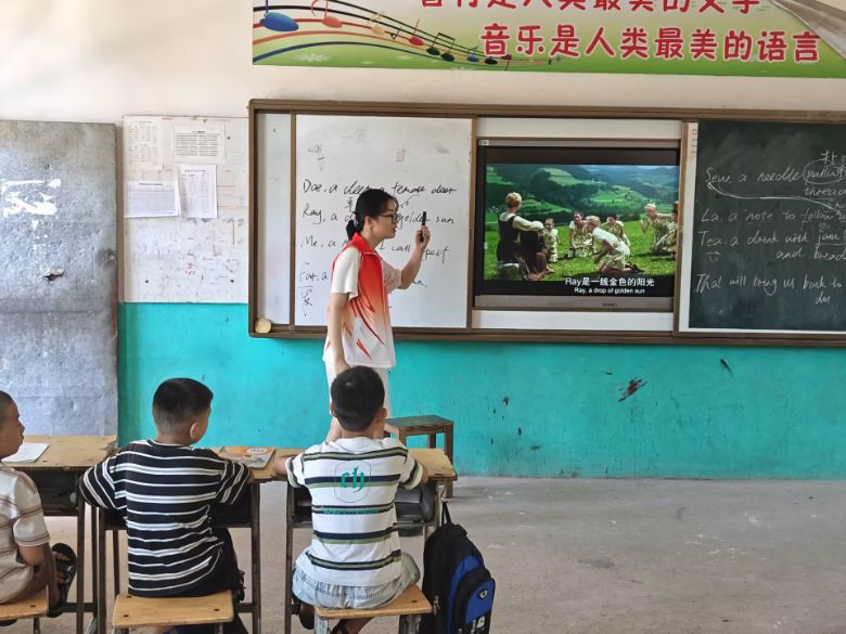 上午課程繽紛呈現(xiàn)。英語課堂里,知識與趣味碰撞,視頻一播,孩子的好奇心瞬間被點燃,跟讀、提問,活力滿滿;語文課上,文字化作舟楫,載著孩子們在文學之海遨游,時而沉思、時而書寫,用文字抒發(fā)對生活的熱愛;美術(shù)課開啟創(chuàng)意盛宴,孩子們盡情揮灑筆墨,大海生物、田野風光躍然紙上,支教隊員穿梭指導,創(chuàng)意在鼓勵中綻放;書法課墨香四溢,老師示范、一對一指導,孩子們從筆畫歪斜到漸入佳境,在一撇一捺間傳承文化;音樂課上,旋律歡快,吉他聲起,孩子們從羞澀到放聲歡唱,歌聲與琴聲交織,奏響鄉(xiāng)村校園的歡樂樂章。