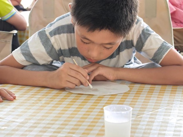 接著進行密信的制作。隊員們提前準備好四種方法,讓同學們分組一同制作密信。其中一種是用棉棒蘸取淀粉溶液在紙上書寫,待紙張干透后,寫上的字便會消失,噴上碘液便可以顯色。隊員循循善誘,旨在引導孩子們發現幾種方法的共同點,運用好顏色的變化。孩子們在紙上認真書寫,密信制作不僅包含了很多有趣的化學變化,也為他們的秘密與夢想找到了抒發和隱藏的方法。