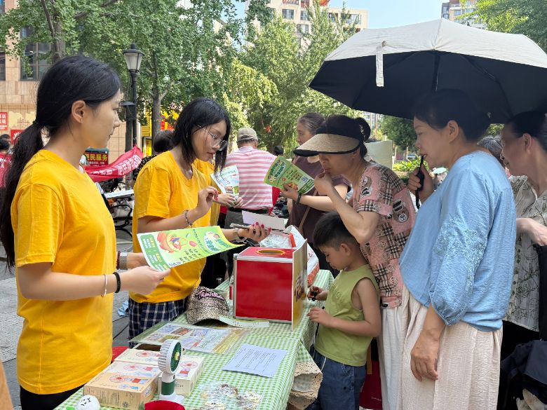 活動伊始,團隊成員們精心布置了科普知識宣講展板、知識問答抽獎區域、活動海報等內容。團隊成員們手持科普宣傳冊走近駐足休息的居民人群中,邀請居民參與到活動當中。居民們也分享交流了許多在生活中遇到的食品安全問題,團隊成員利用專業優勢進行了耐心的解答。