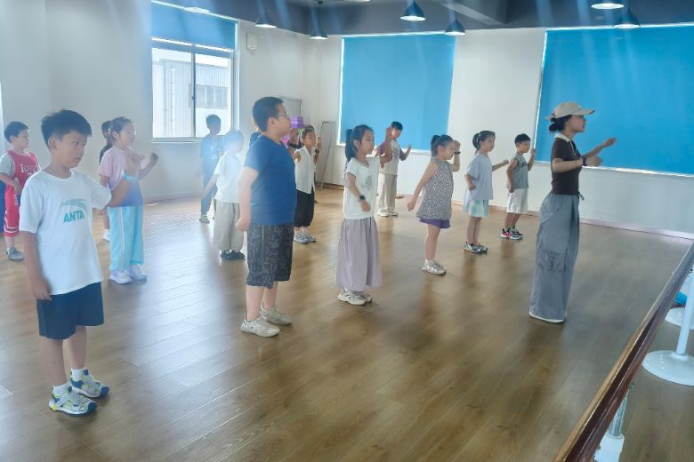 有個小男孩動作總是不協調,跳著跳著就亂了節奏。老師蹲下來,手把手教他:"先抬左腳,再拍手,對,就是這樣!"他試了幾次,終于跟上了,開心得直蹦。其他孩子也圍過來,有模有樣的跟著一起做。