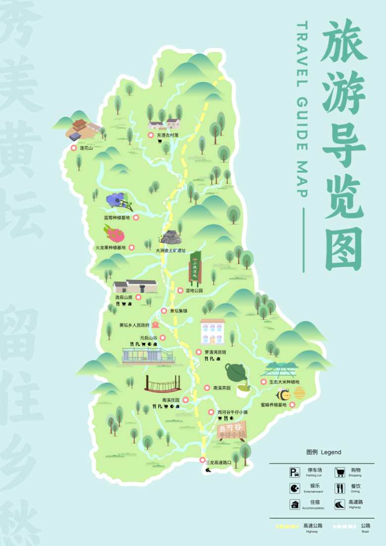 為此,團隊重構(gòu)導(dǎo)覽邏輯:在矢量插畫版導(dǎo)覽圖上,每個景點旁都標(biāo)注非遺關(guān)聯(lián)點——比如“南溪茶園”旁印著“步行5分鐘至農(nóng)品館,嘗用山泉水制作的粉皮”;“元啟山谷”標(biāo)注“此處溪流為粉皮制作的水源地,附匠人取水場景插畫及文字說明”。導(dǎo)覽圖還附帶“黃壇好物打卡地圖”,游客集齊3個農(nóng)品館印章可兌換非遺手作體驗券。這種景—物—文化的串聯(lián)設(shè)計,讓導(dǎo)覽圖從路線圖變成消費指南。