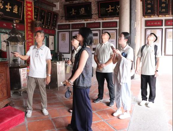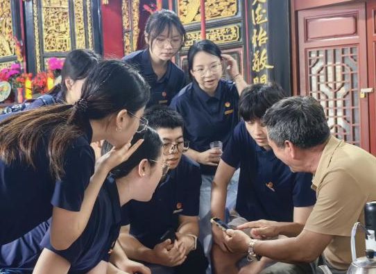在剪瓷雕陳列館與沈氏大宗祠“饗保堂”,福建省省級剪瓷雕工藝(詔安)第五代傳承人沈錫仁與隊員們展開了一場傳統與現代的深入對話。陳列館內,沈老師不僅向隊員們解析剪瓷雕技藝的技術精髓,更分享了他將人工智能技術與傳統技藝融合的創新構想,展現出非遺傳承人立足傳統、開拓創新的前瞻視野。實踐隊員小湯表示,“沈老師對藝術的熱忱,對傳統工藝傳承發展的深刻思考,讓我對非物質文化遺產的保護與創新有了全新的認識。”
