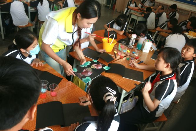 實踐隊成員引導同學們用鈍頭鉛筆創作獨特的KT版版畫,將“KT版版畫”與“順德糕點刻模文化”相結合。實踐隊成員向學生們講解版畫的制作方法,讓學生們通過觸覺這一的方式在觸摸版畫紋路中感受知順德糕點紋路。學生們在刻畫、上色中體驗KT版版畫的制作,同時畫下他們對順德糕點文化的理解。這種創作對小學生具有教育意義,既能傳承地方非遺文化,又能培養藝術創造力,還能促進跨學科學習,這讓傳統文化變得可觸可感,更讓小學生樹立起“文化小傳承人”的身份認同。