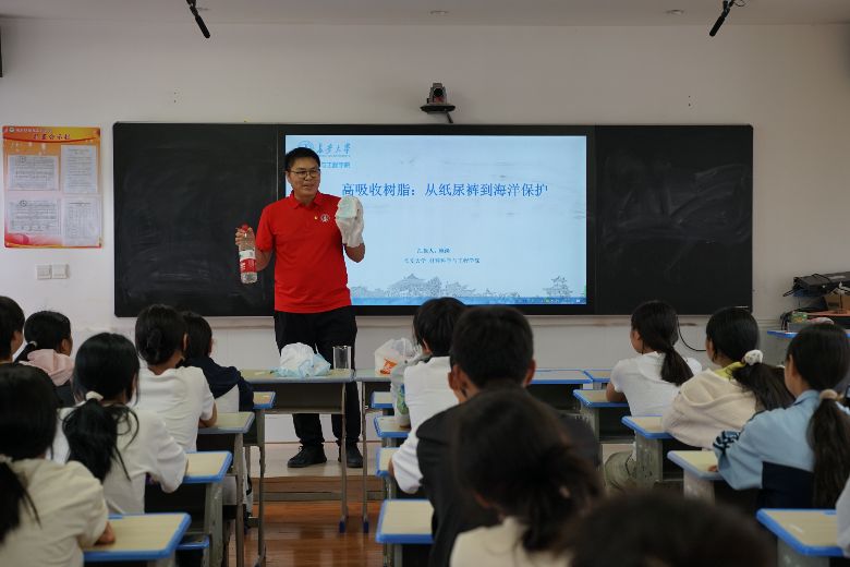 博士賴淏將一小勺白色粉末倒入水杯,瞬間膨脹凝固。“這就是紙尿褲里的‘超級海綿’!”他話鋒一轉,“但它的使命不止于此——吸油樹脂能高效吸附海洋油污,一克材料可‘吞’下自重三十倍的原油!”現場學生爭相觸摸吸油樹脂模型,感受科技守護藍海的魅力。