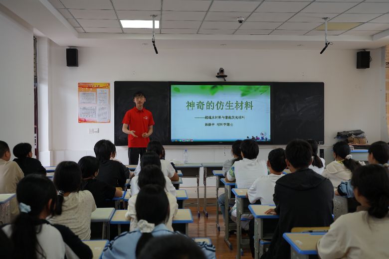 博士孫新宇將水噴灑液滴在特制涂料板上滾落如珠,仿生荷葉效應引發陣陣驚呼。 “這就像給建筑穿‘雨衣’,未來涂上這種材料,校舍墻面永不潮濕霉變!”接著,他關閉教室燈光,自制的蓄能發光板在黑暗中泛起柔和的藍綠色光芒。“無需電源,吸收光就能持續發光”,讓同學們直呼“科幻成真”。