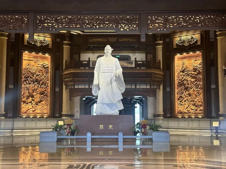 步入兵圣宮大廳,一尊8米高的漢白玉孫武雕塑瞬間吸引了實踐隊隊員的目光。孫武手持兵書,腰挎寶劍,目光深邃而堅定,仿佛正在俯瞰著整個戰場,運籌帷幄,決勝千里。他的身姿挺拔,氣勢非凡,讓人感受到了一代兵圣的卓越風采和超凡智慧。圍繞著雕塑,四幅東陽木雕依次展開,細膩地描繪了古代將帥指揮作戰的全過程。從戰前的精心謀劃,到戰場上的靈活應變,再到勝利后的凱旋而歸,每一個場景都充滿了緊張與激情,讓實踐隊隊員仿佛置身于那個戰火紛飛的年代,親身感受到了戰爭的殘酷與無情,以及兵家謀略的重要性。