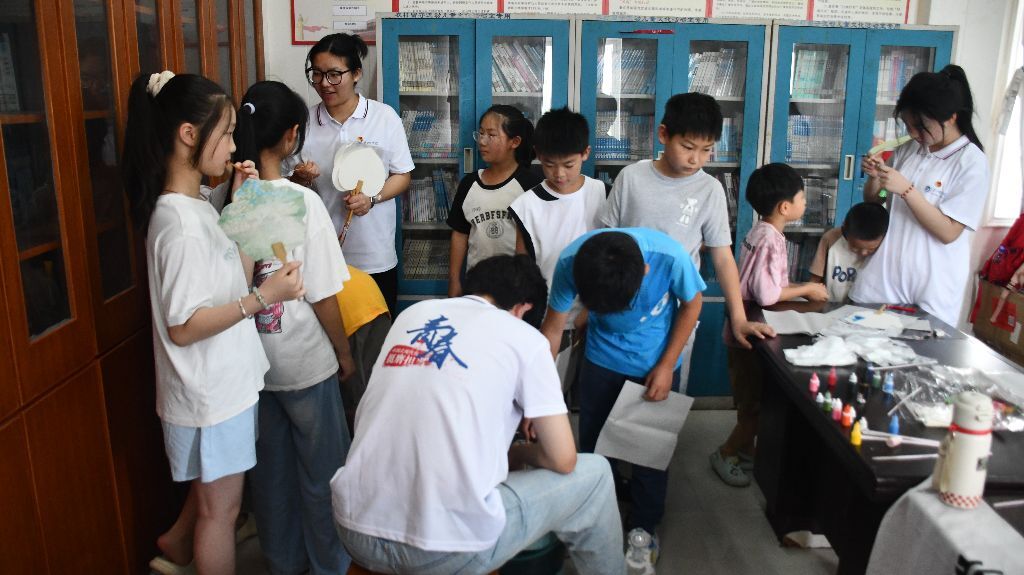 圖為實(shí)踐團(tuán)成員和小朋友一起做漆扇。楊謝超 攝