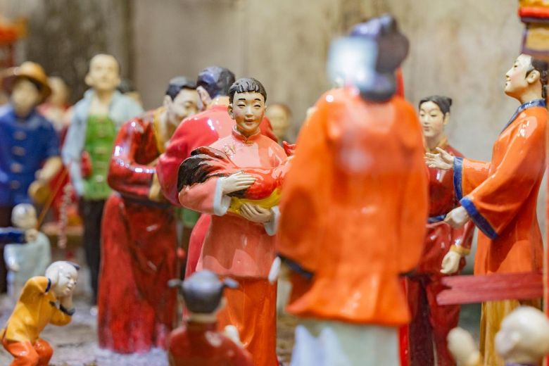三樓“漁海華章”展廳將非遺技藝與婚俗場景相結合,成員們首次了解到獨特的“阿姑代拜堂,公雞陪洞房”之諺。
